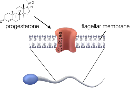 鈣離子的主色是鞭毛中稱為CatSper的精子特異性離子通道,因此在協調精子行為中佔據中心位置。CatSper被輸卵管中的激素啟動,特別是由卵丘細胞釋放的黃體酮。