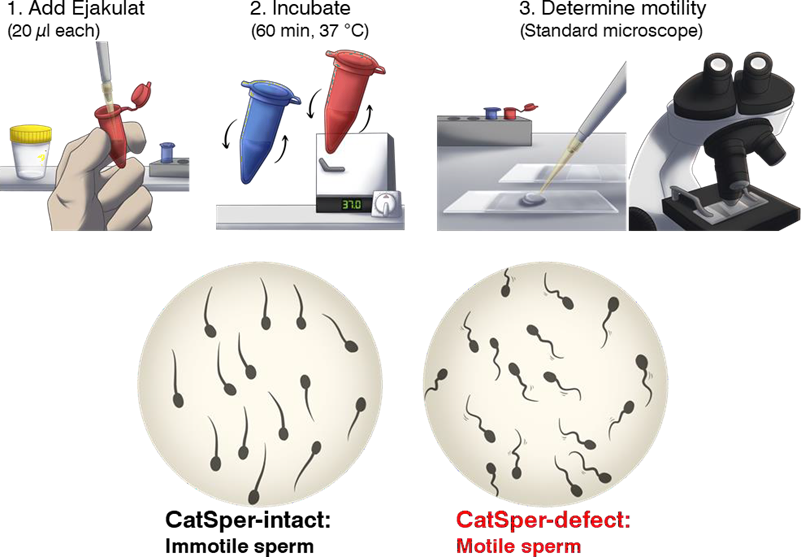 明斯特大學醫院生殖醫學和男科中心 (主任醫師:Sabine Kliesch 醫學博士教授),Timo Strünker 教授博士的工作組開發了一項測試,可以簡單有效地評估 CatSper 的功能。這種「CatSper 測試」可以作為精液分析的一部分常規進行。該測試發表在一項包含近 2,300 名患者的科學研究:
