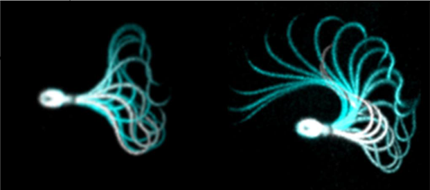 單個精子細胞在黃體酮刺激之前(左)和之後(右)的兩個鞭毛搏動週期的疊加圖像系列。與對稱、低振幅的鞭毛搏動(左)相反,過度活化的鞭毛攞動(右)是不對稱的,並且具有高振幅。